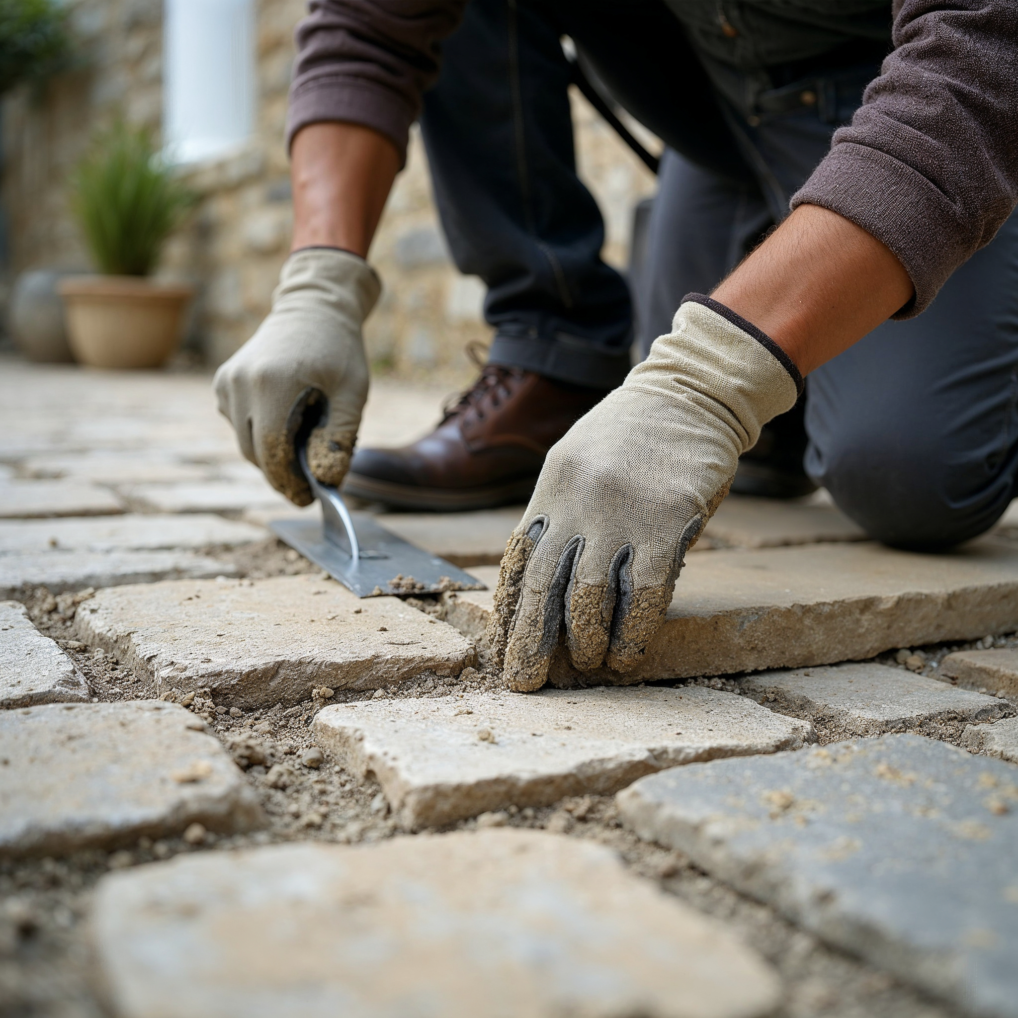 Nous préparons le mortier ou produit de rejointement adapté au support (mur en pierre, brique ou dallage) et humidifions les surfaces si nécessaire pour optimiser la prise et la durabilité.